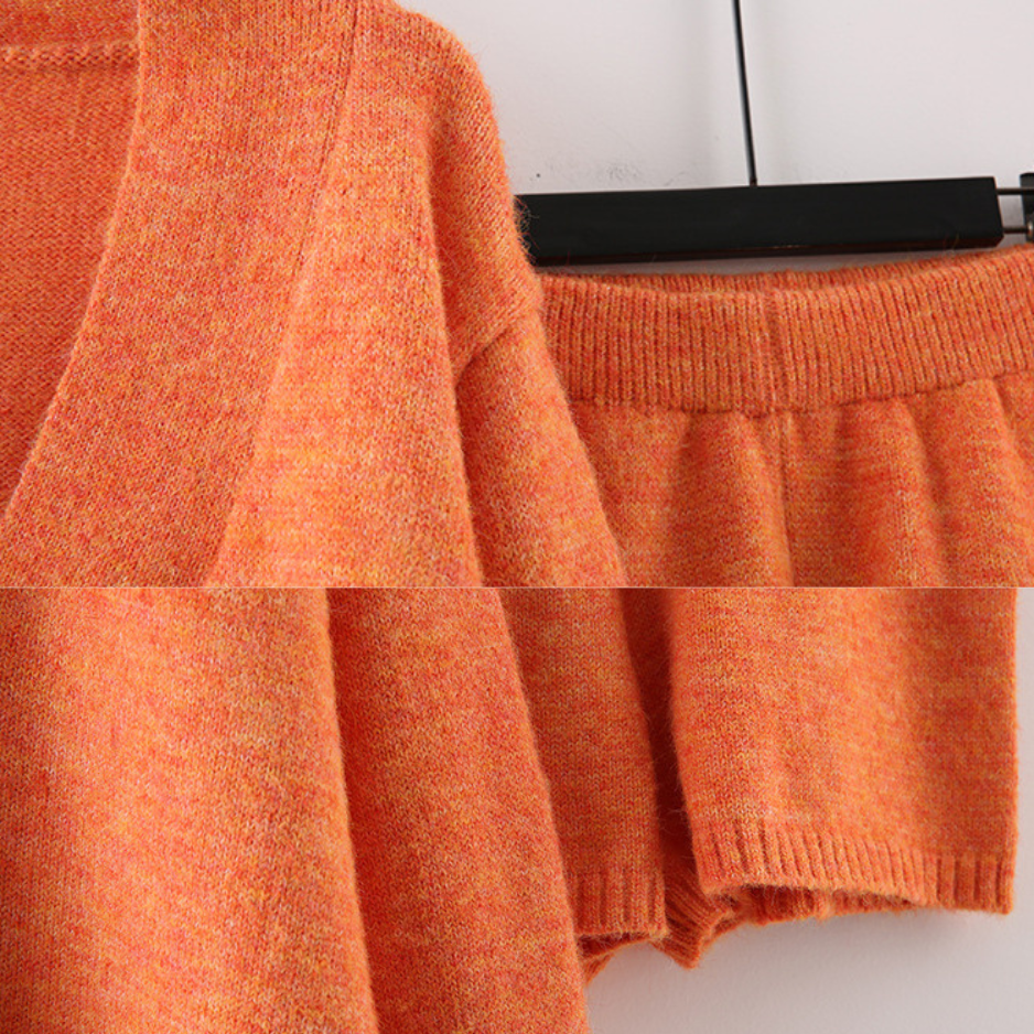 The Lana Knit Set blends effortless comfort with a soft, feminine touch. Featuring a relaxed deep-V sweater paired with warm lounge shorts, this set brings a cozy yet subtly sexy silhouette — perfect for staying warm while looking elevated.