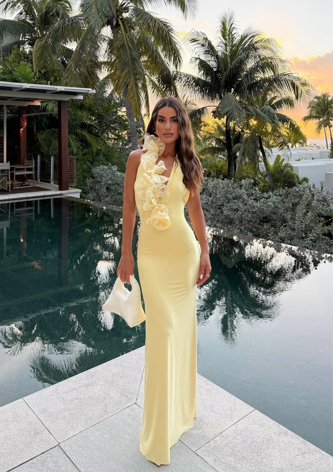 Ivory Rosette Draped Satin Maxi Dress