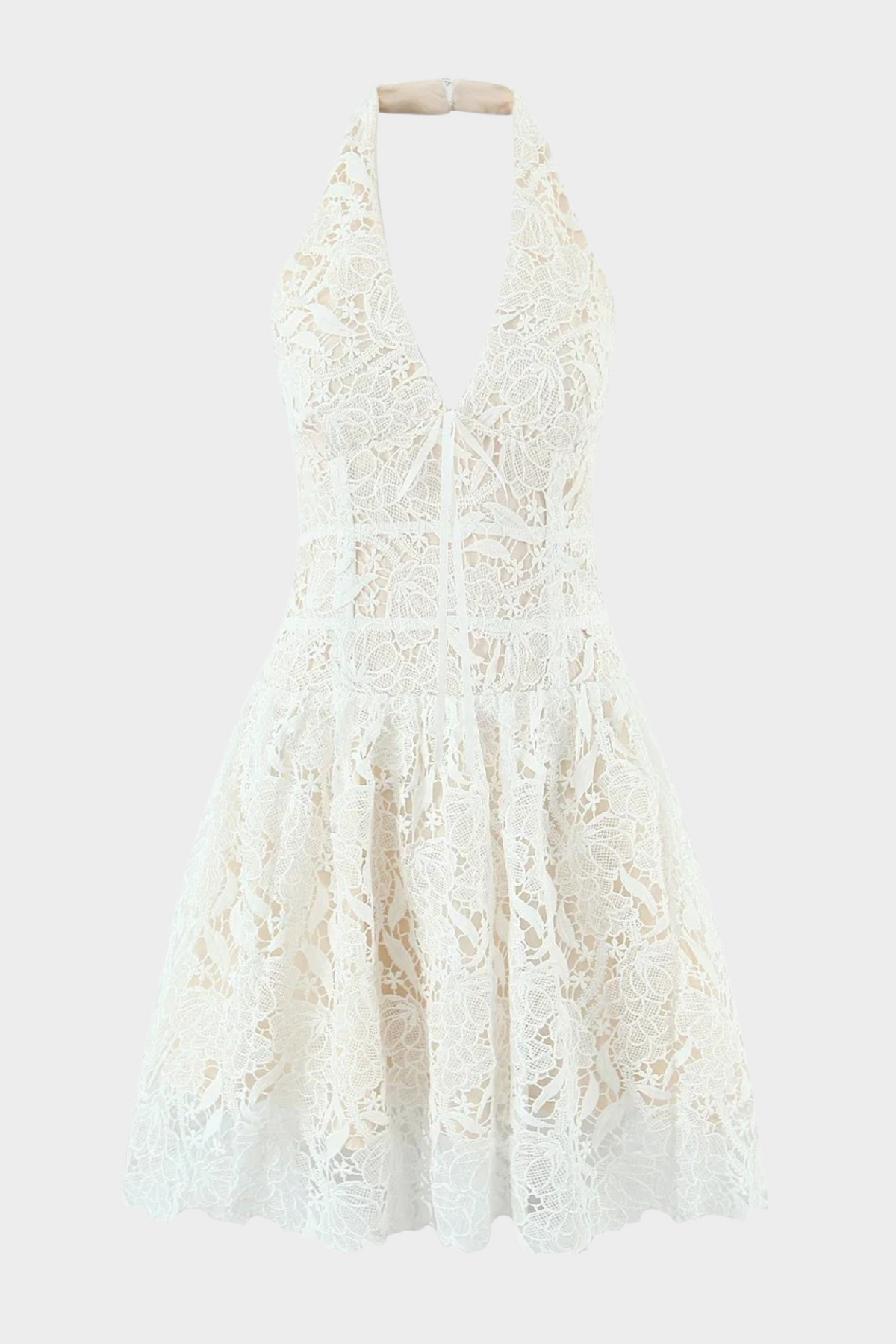 Deep halter neckline with a flattering plunge for an elegant, feminine silhouette.