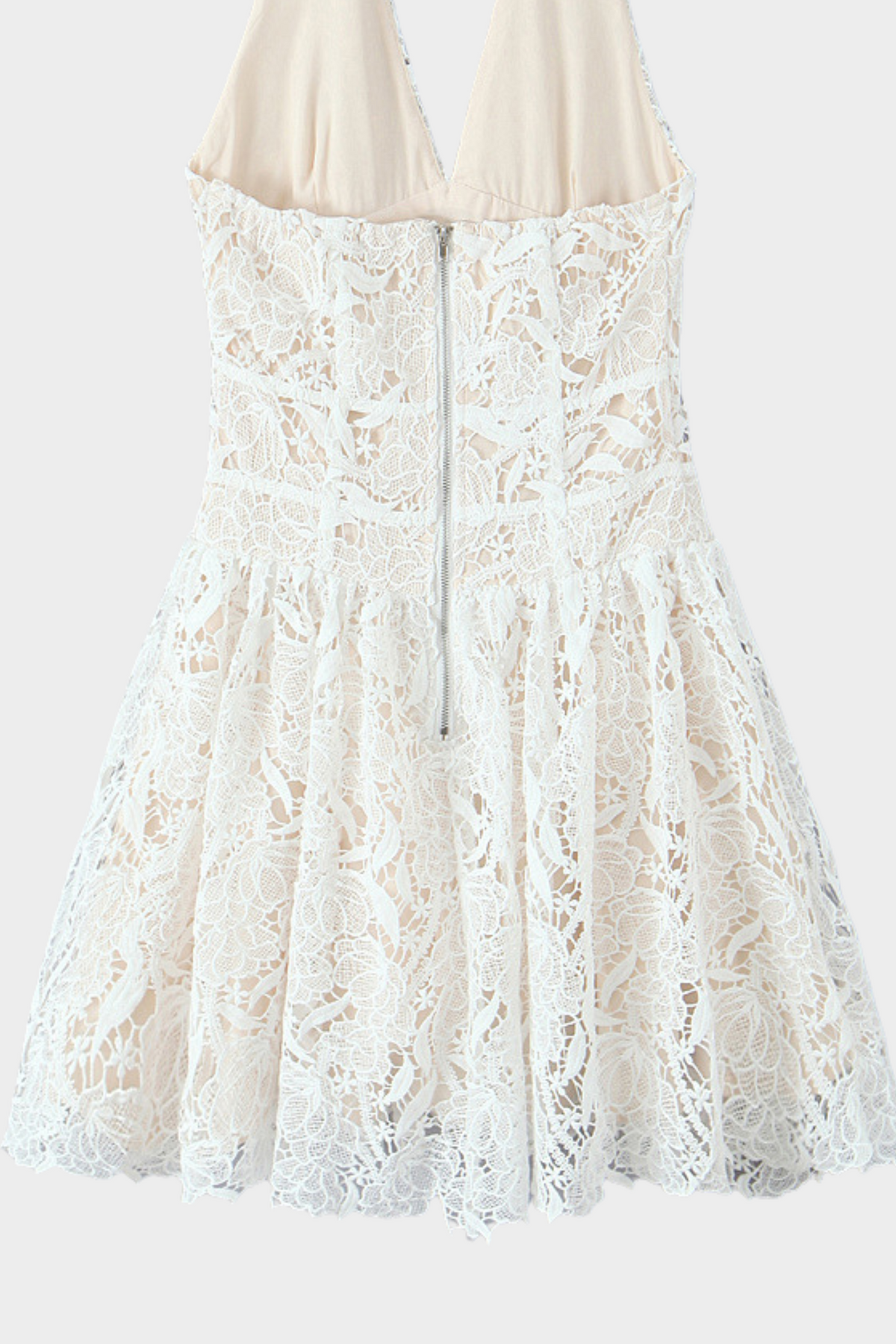Backless design with a secure halter strap and zip closure for comfort and ease.