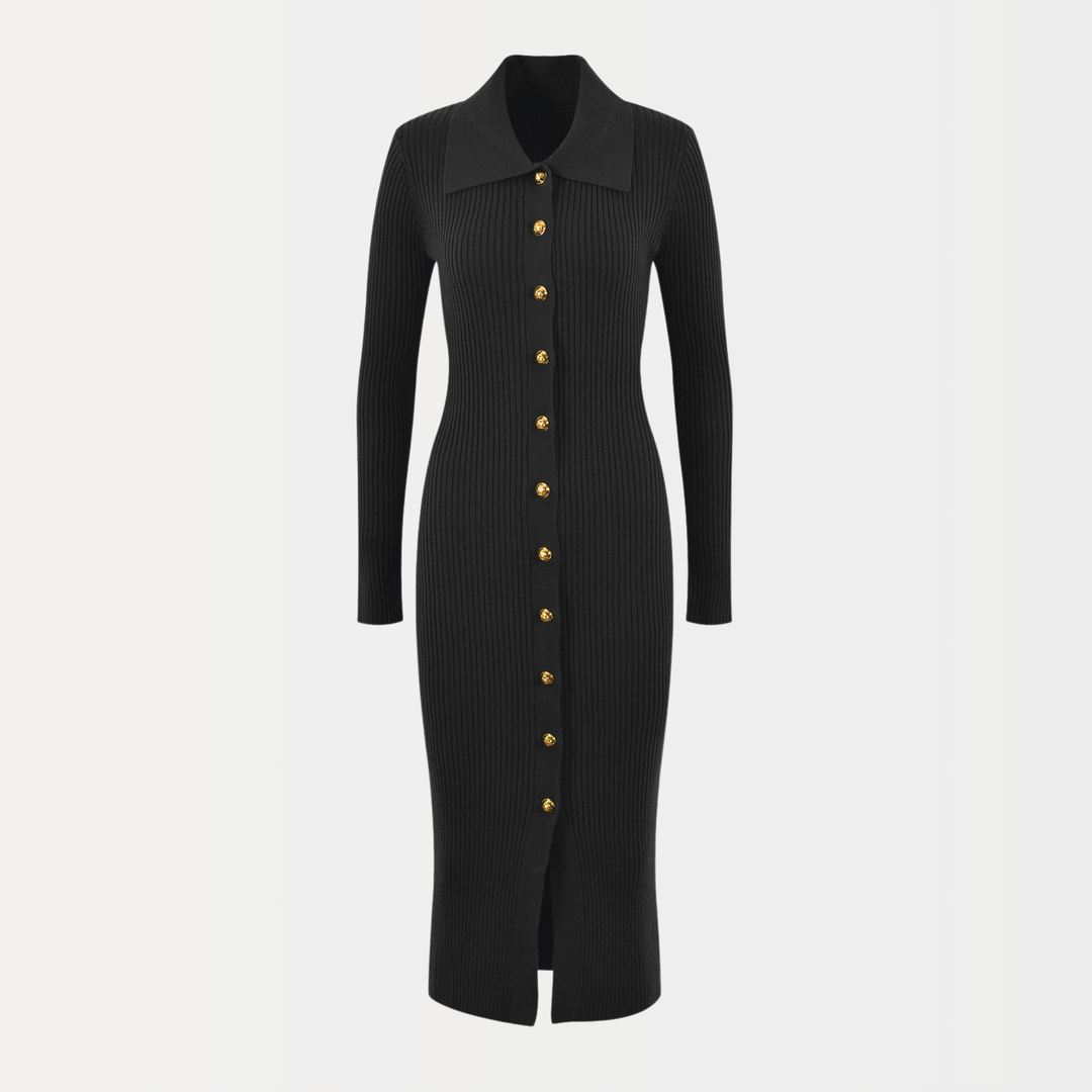 Viscose Lapel Gold Buttons Flared Hem Maxi Dress