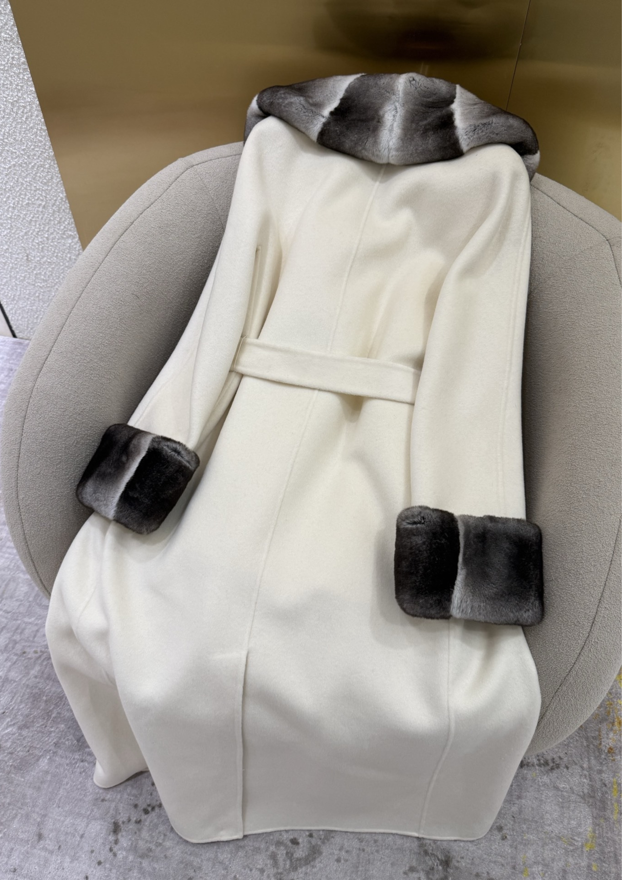 Made from premium double-woven cashmere wool, this coat features an exquisite gradient mink fur collar and matching cuffs, hand-selected for their plush softness and stunning natural shine.