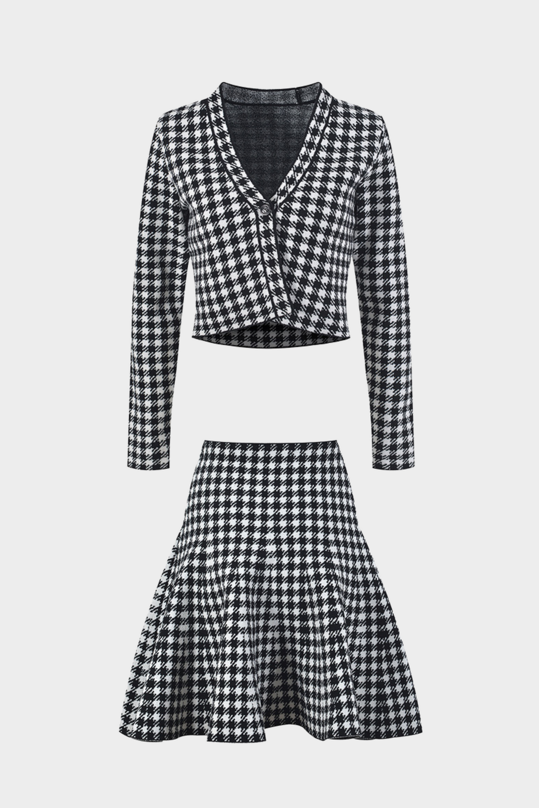 Chic Knit Houndstooth Long Sleeve Mini Skirt Set
