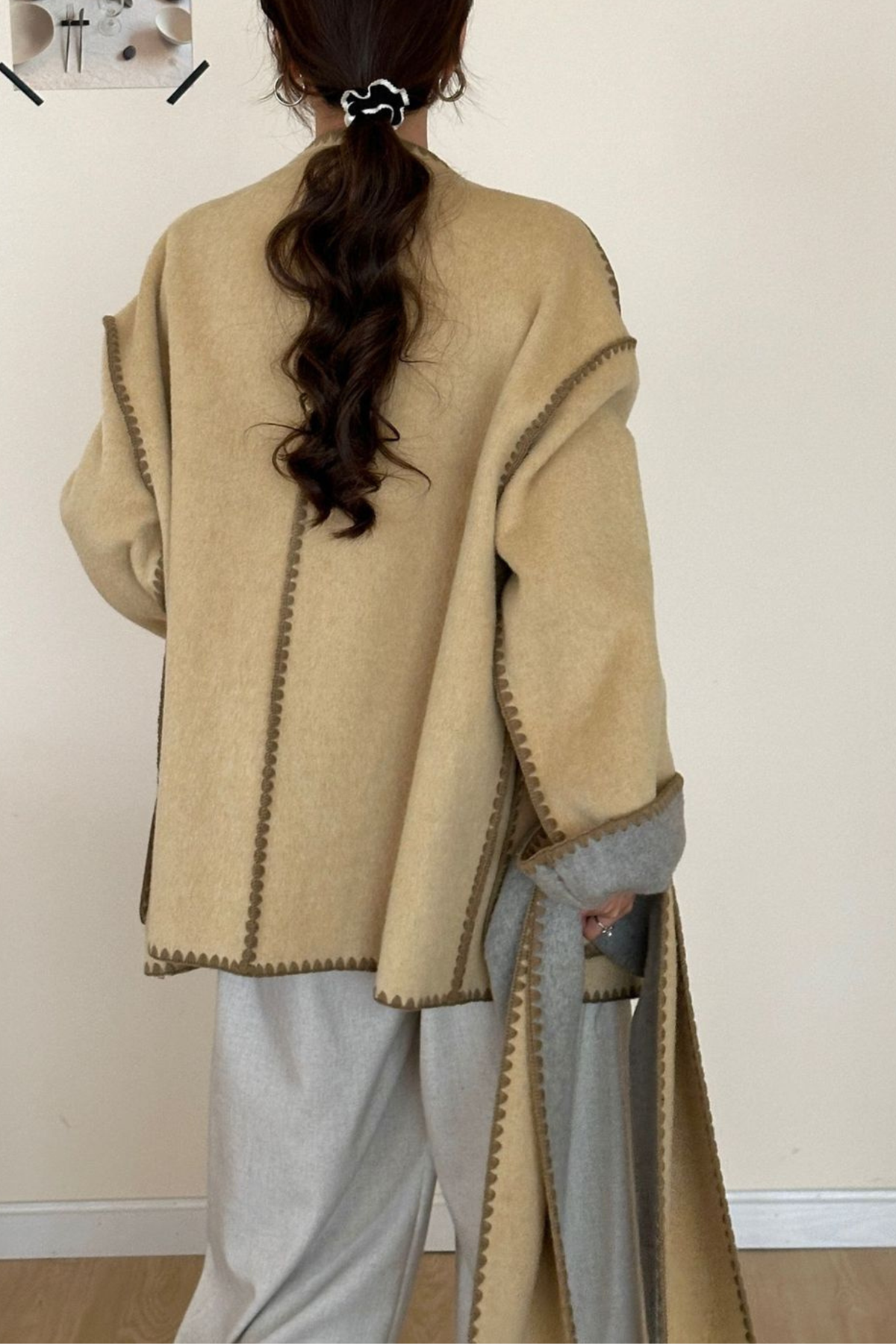 Comes with a matching extra-wide scarf in the same double-faced fabric for easy layering (styled draped or wrapped).