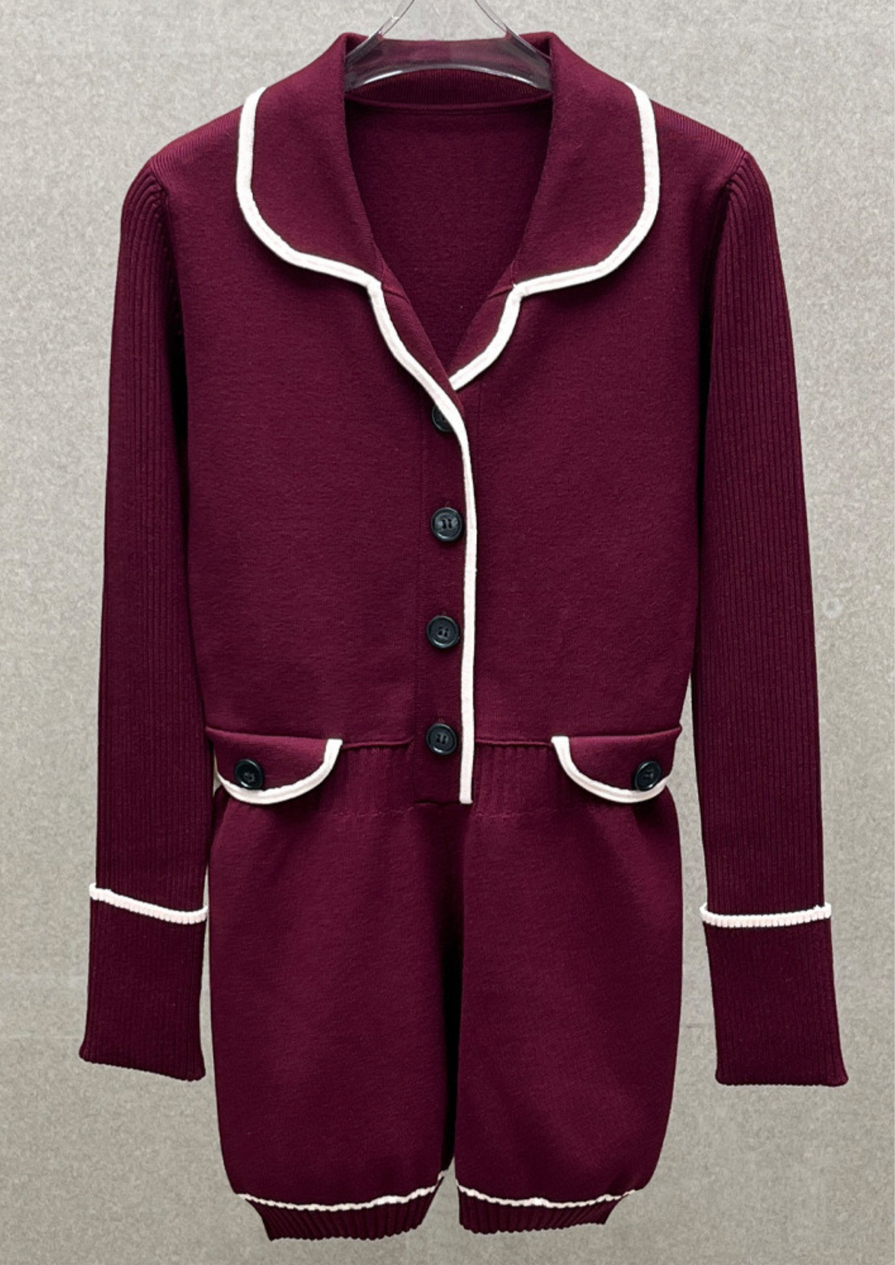 A timeless knit playsuit designed to sculpt and flatter. Crafted from a soft viscose blend, this fitted silhouette features a classic collared neckline, button-front detailing, and delicate contrast trims that elevate the look with subtle elegance. Long sleeves and tailored shorts create a balanced, refined finish—perfect for effortless day-to-night styling.