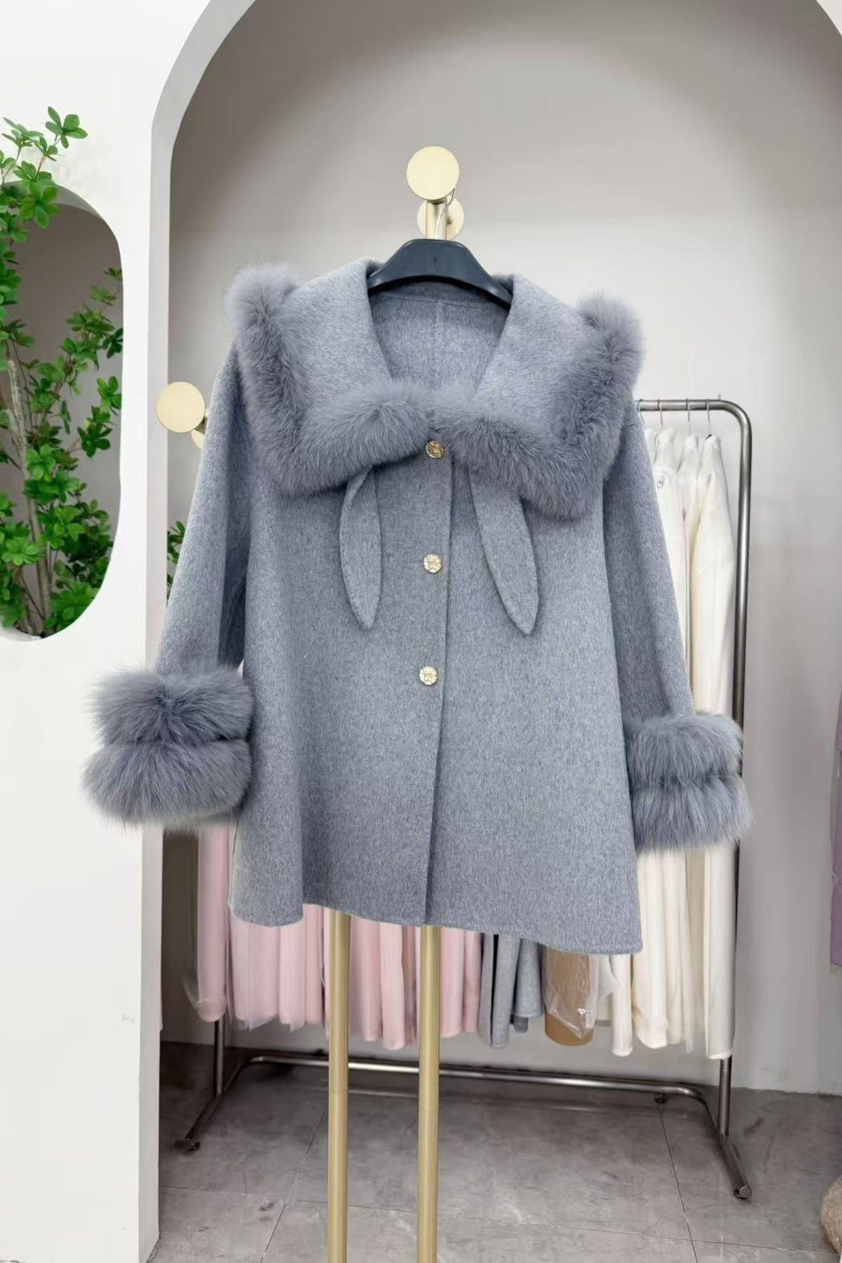 A sweet, A-line mini coat in soft brushed wool blend, finished with a wide Peter-Pan collar trimmed in plush fur and matching double-tier fur cuffs. The front closes with three jewel-like gold buttons and a playful bunny-ear tie at the neckline. Cut to a swing silhouette that skims the hips for easy layering and a flattering drape. Available in powder pastels (lilac, baby blue, butter cream, ivory) and classic grey. Fully lined; long sleeves; clean hem. Cozy, lightweight, and irresistibly cute for winter dates, holidays, and photos.
