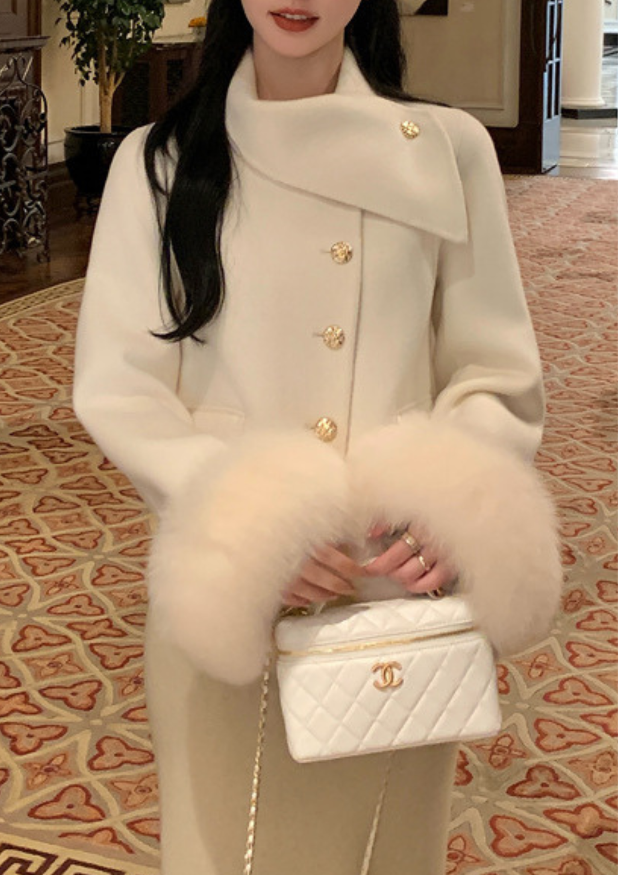 A refined statement piece with soft structure and elegant fur accents.