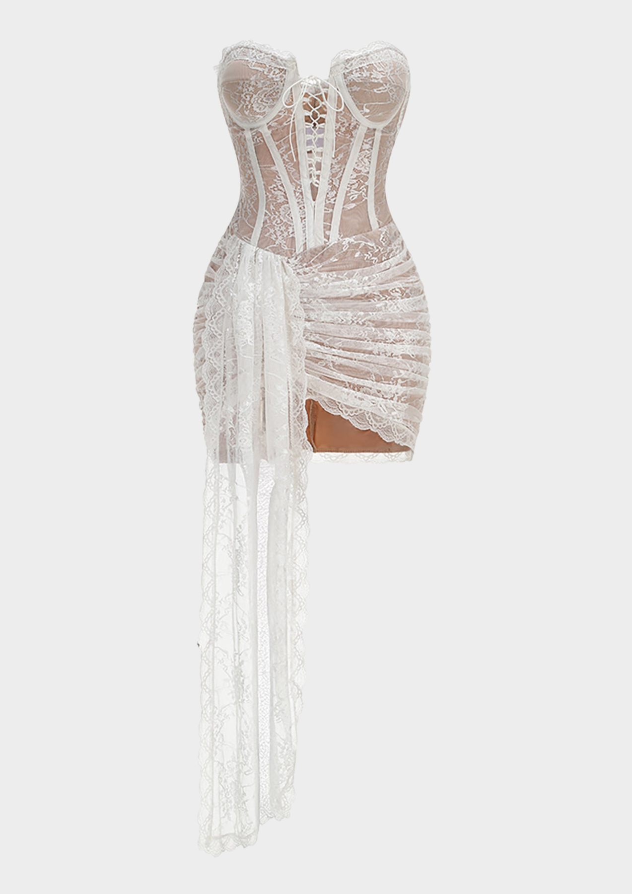 A statement strapless mini dress crafted from delicate lace, featuring a structured corset bodice with boning for a sculpted silhouette. Finished with an asymmetric lace drape that adds drama and movement.