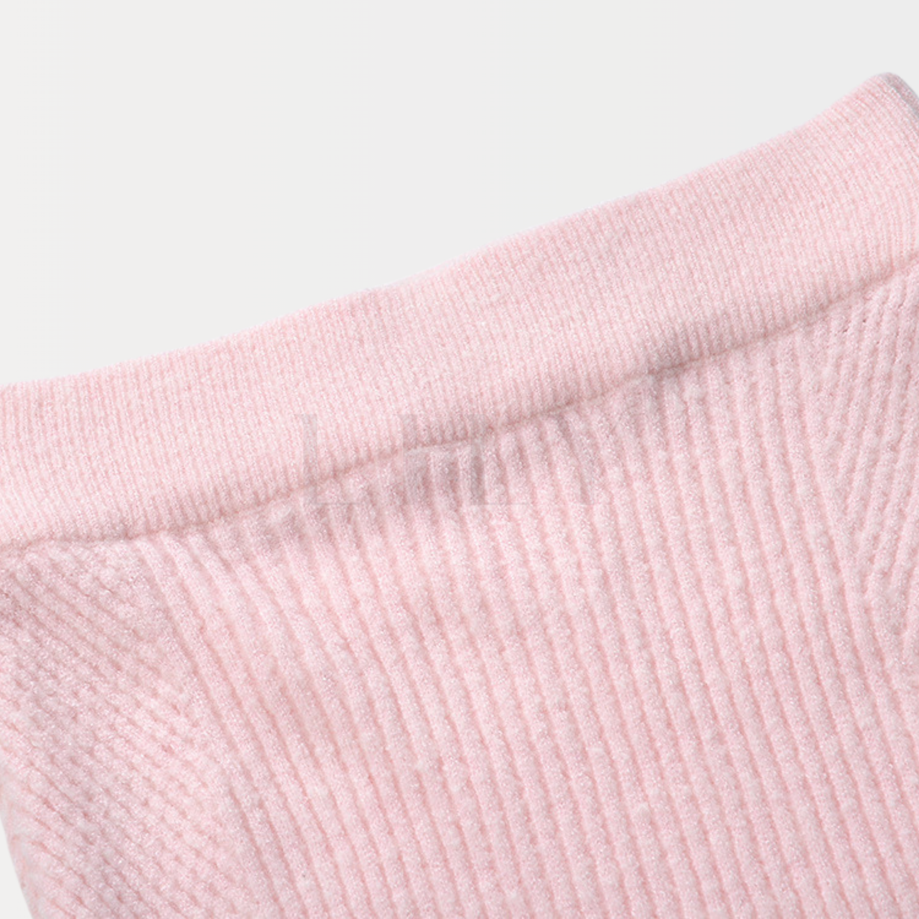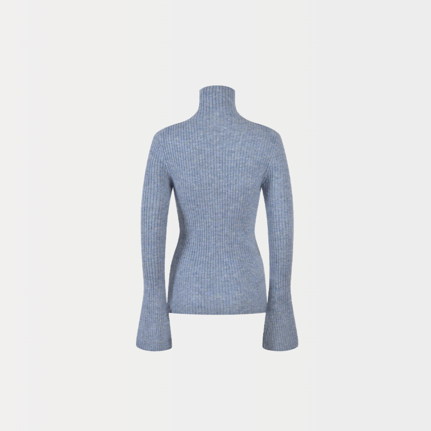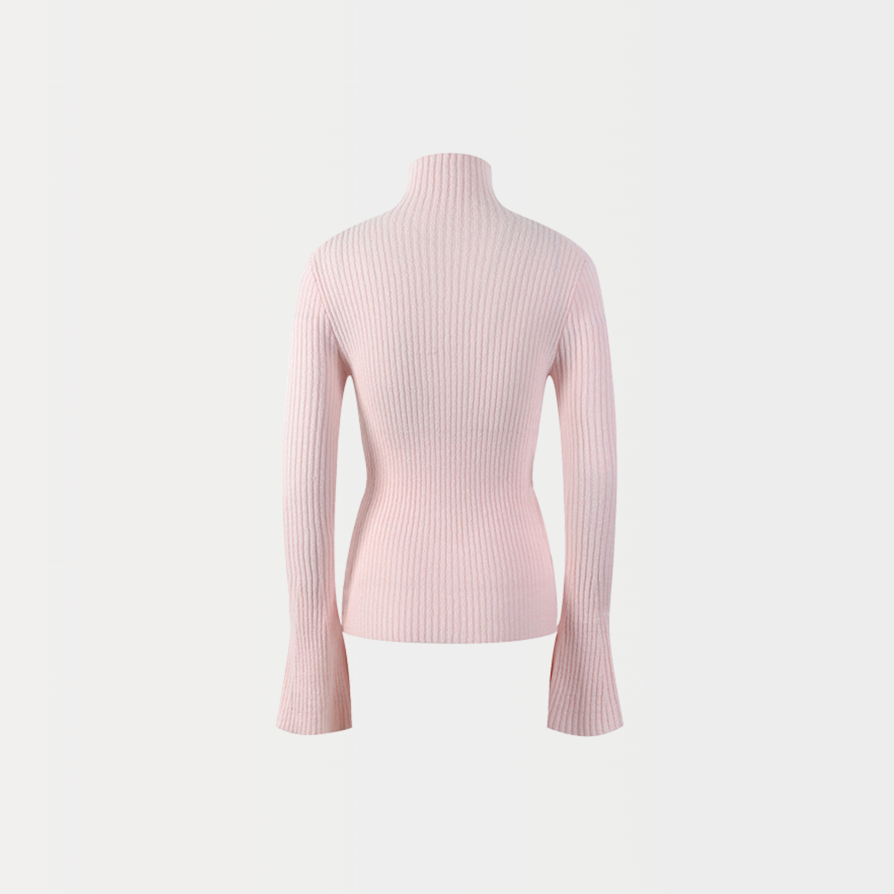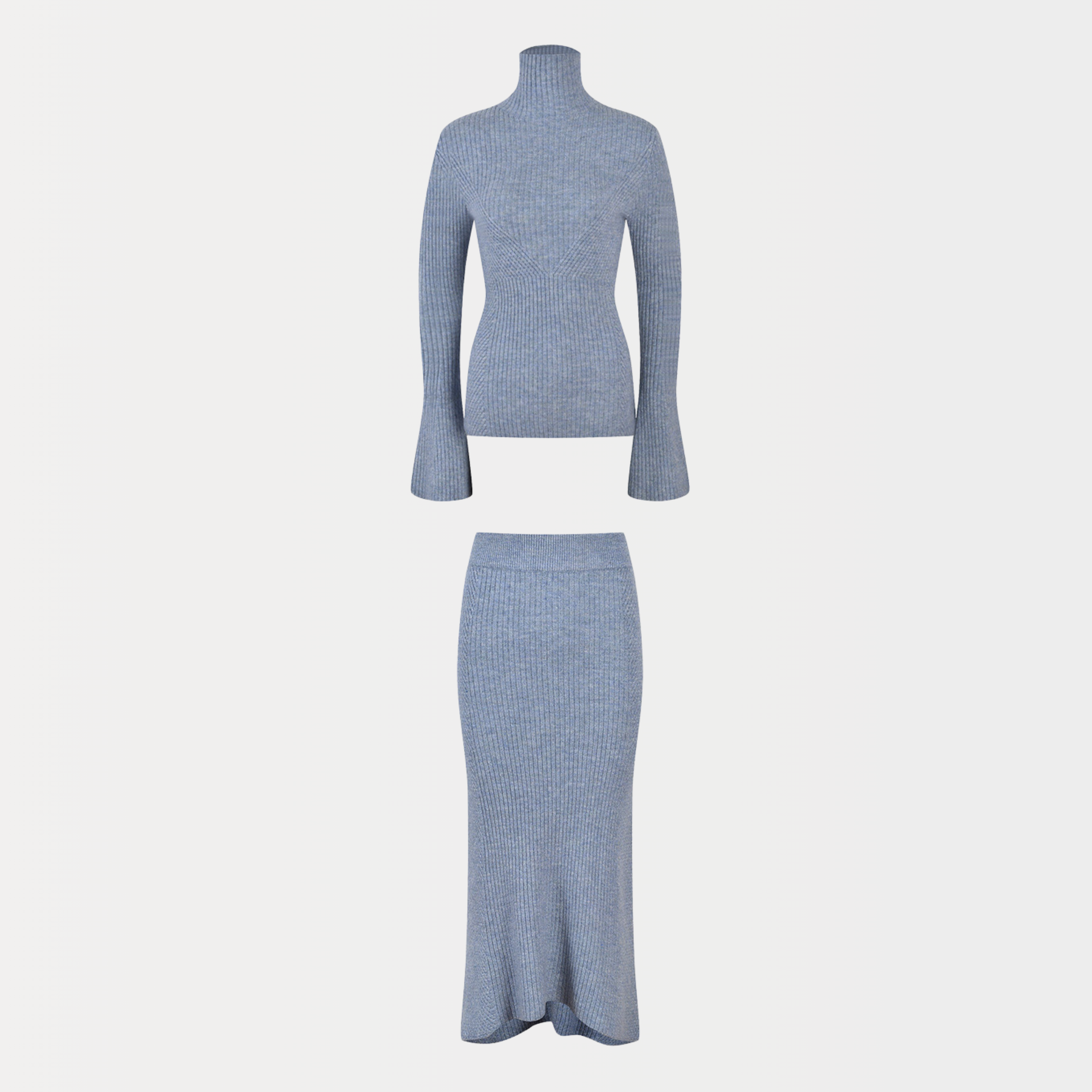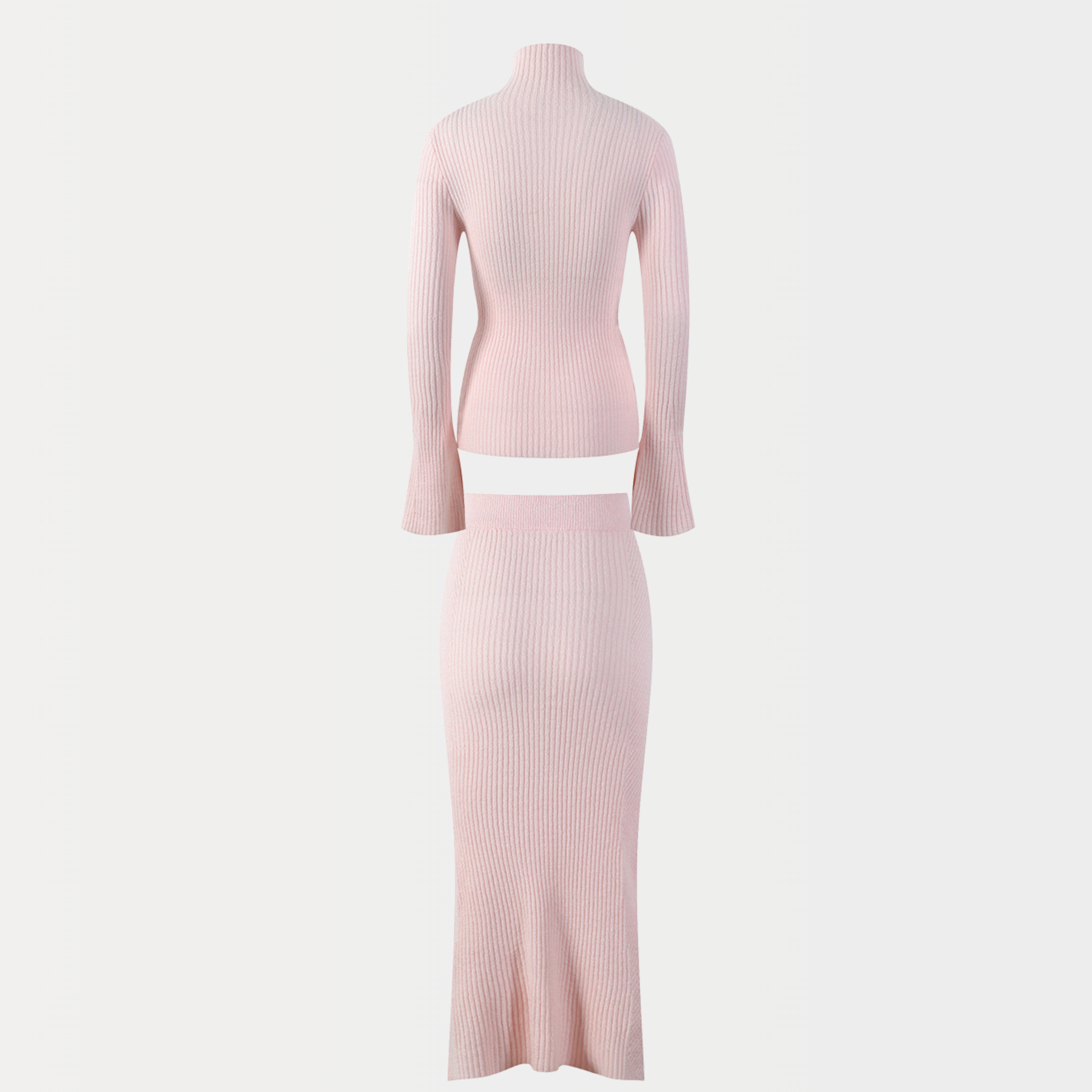 Coordinating ribbed turtleneck with detailed knitting to accentuate the waistline.