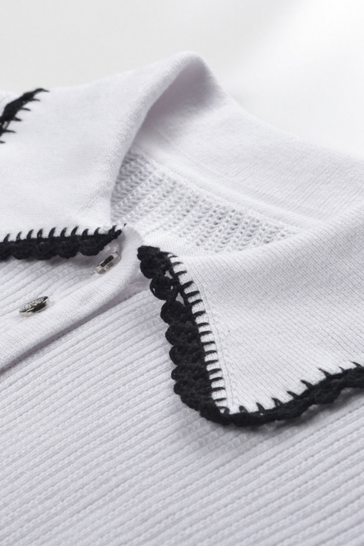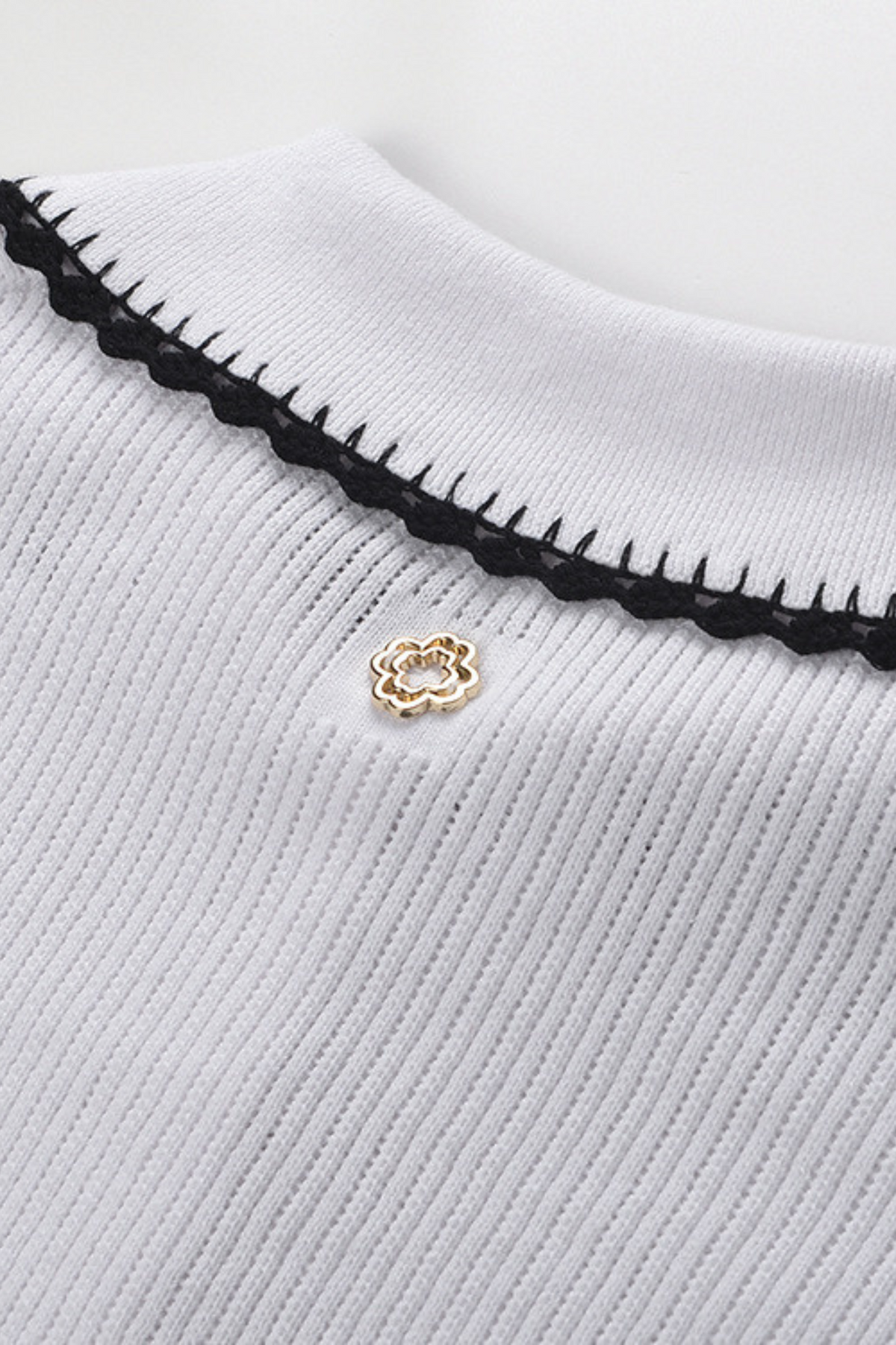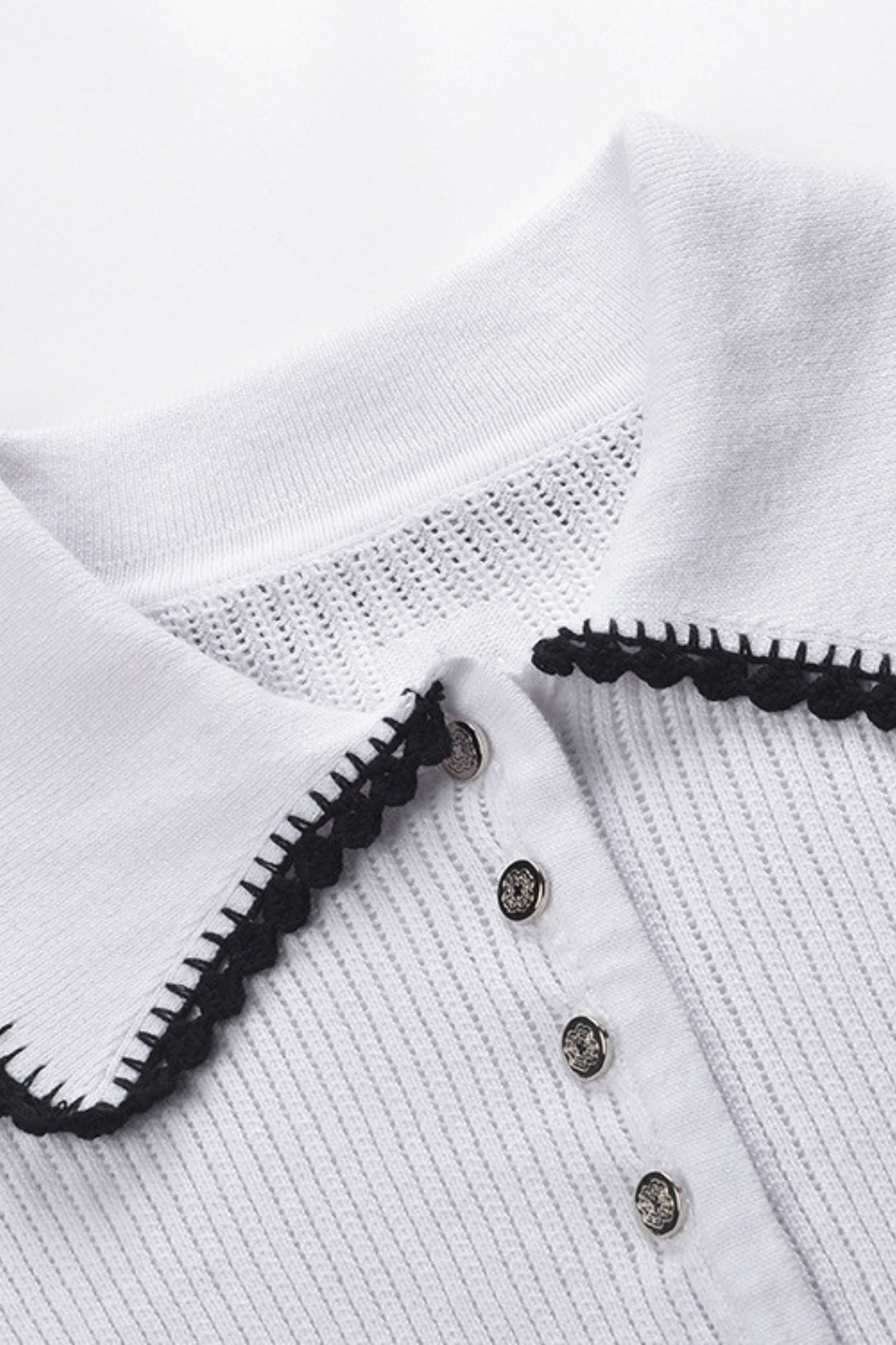 Features a classic polo collar outlined with delicate contrast lace detailing.