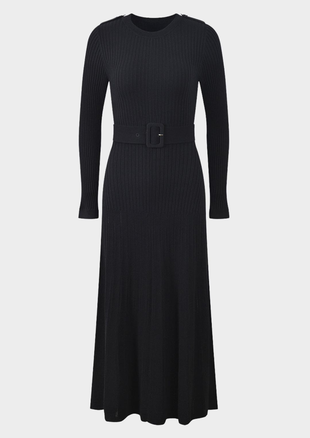 Belted Ribbed Knit Viscose Pleated Elegance Maxi Dress