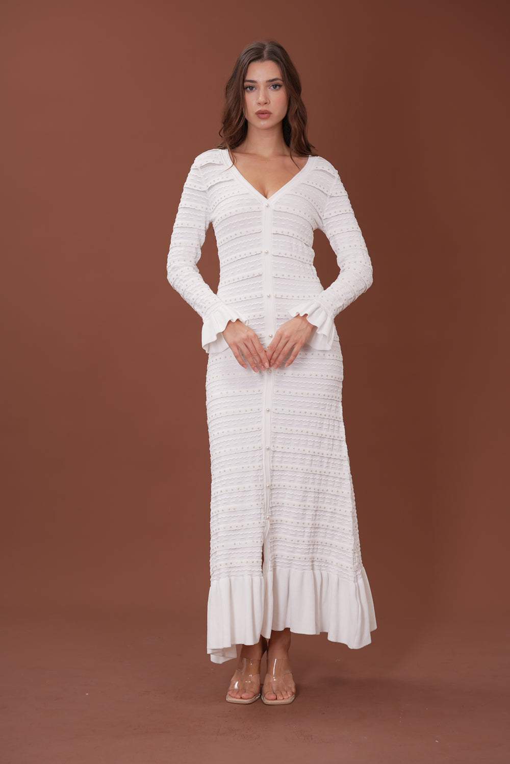 Ivory Luxe Hollow Golden Button Viscose Knit V-Neck Maxi Dress