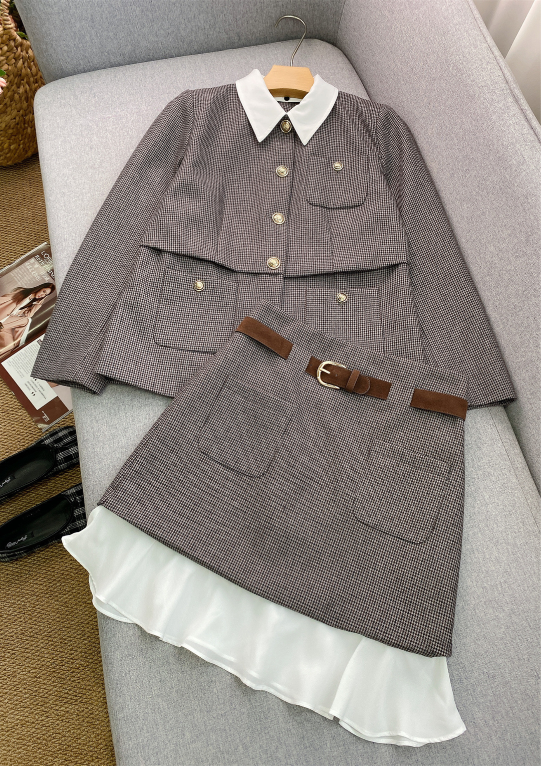 Chic Knit Houndstooth Long Sleeve Mini Skirt Set