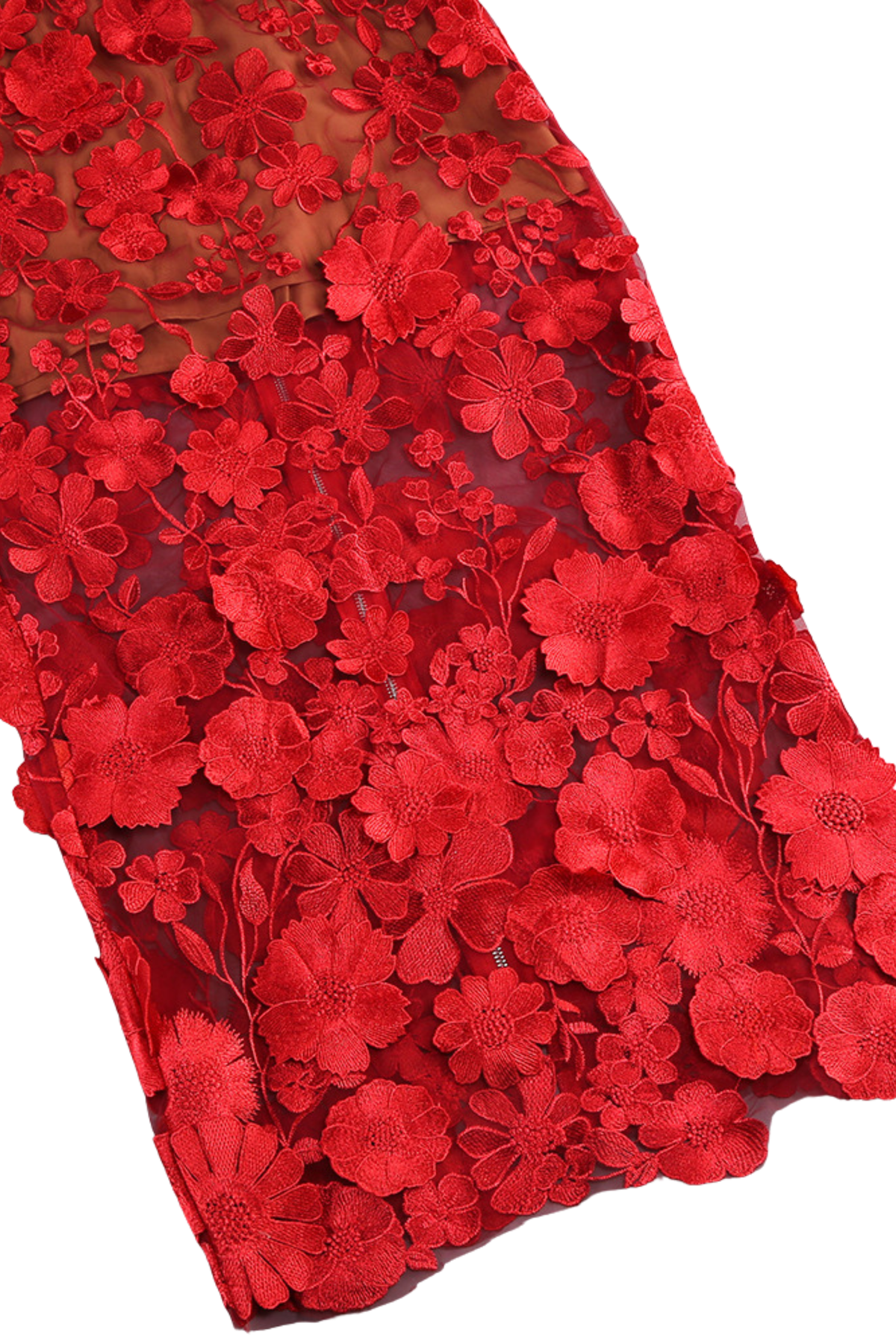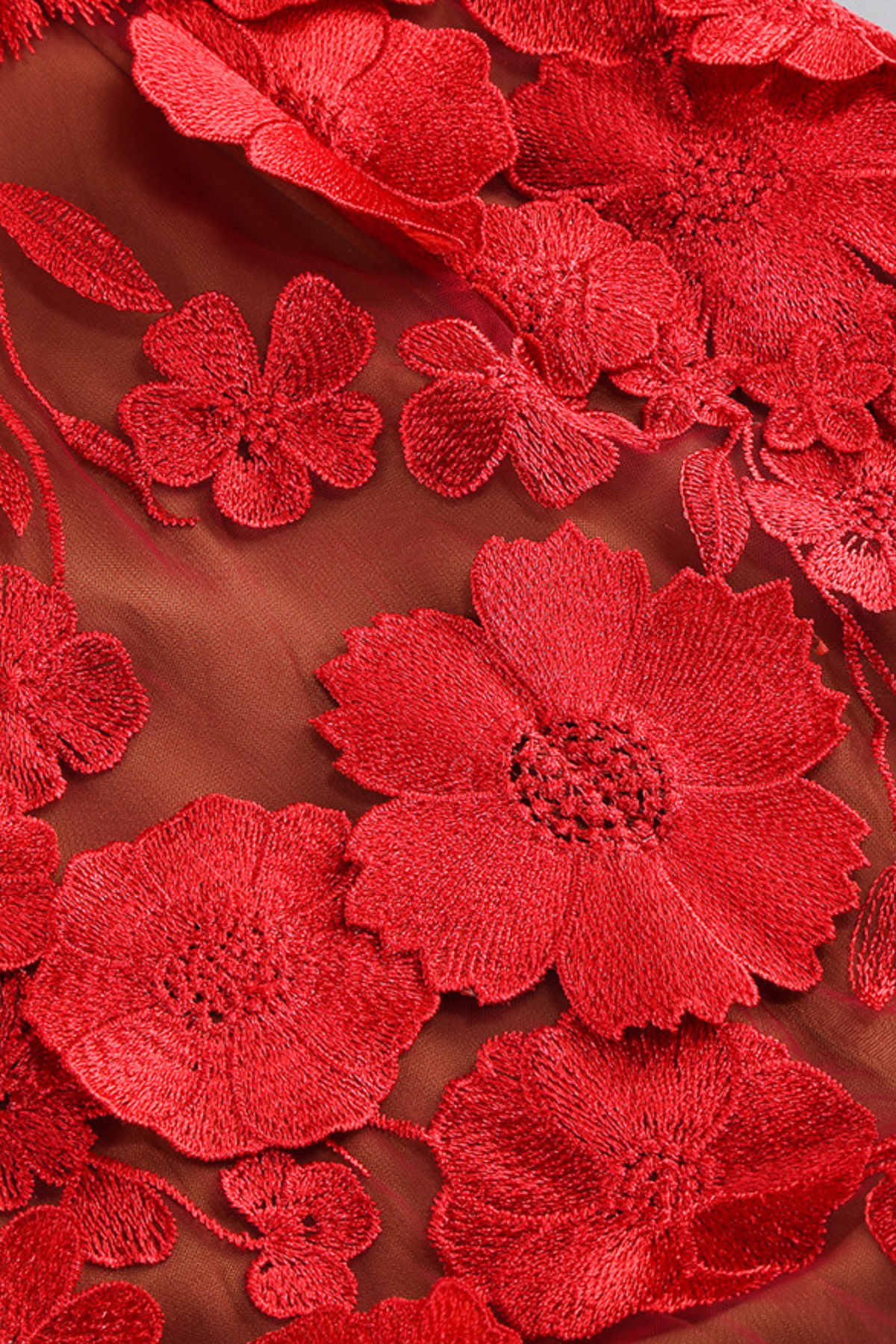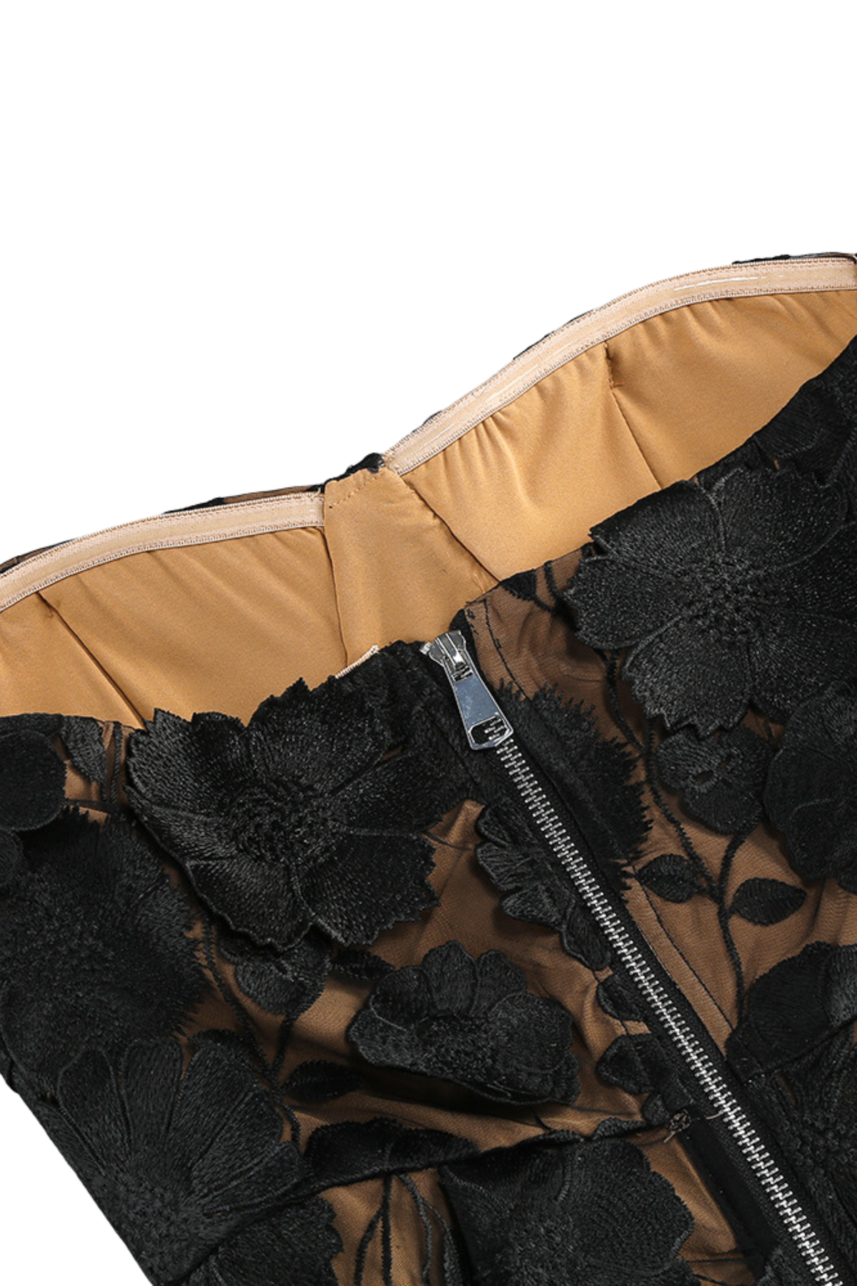 • Nude mesh base with intricate black 3D floral appliqué embroidery