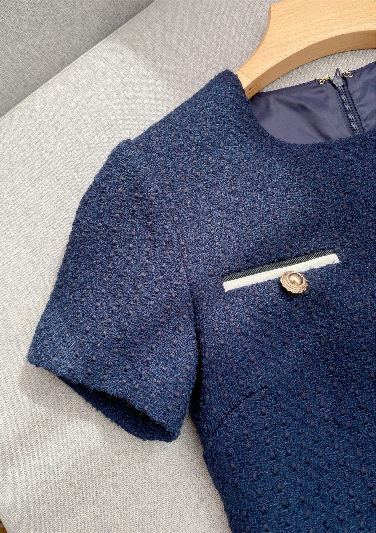An elegant navy tweed mini dress with a round neckline, contrast trim pockets, and a matching structured belt for a polished, low-waisted silhouette.
