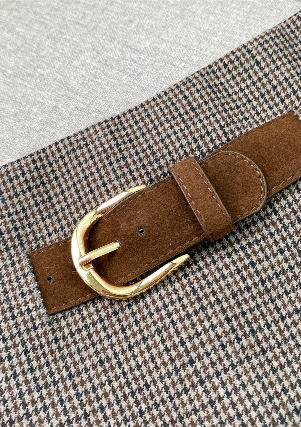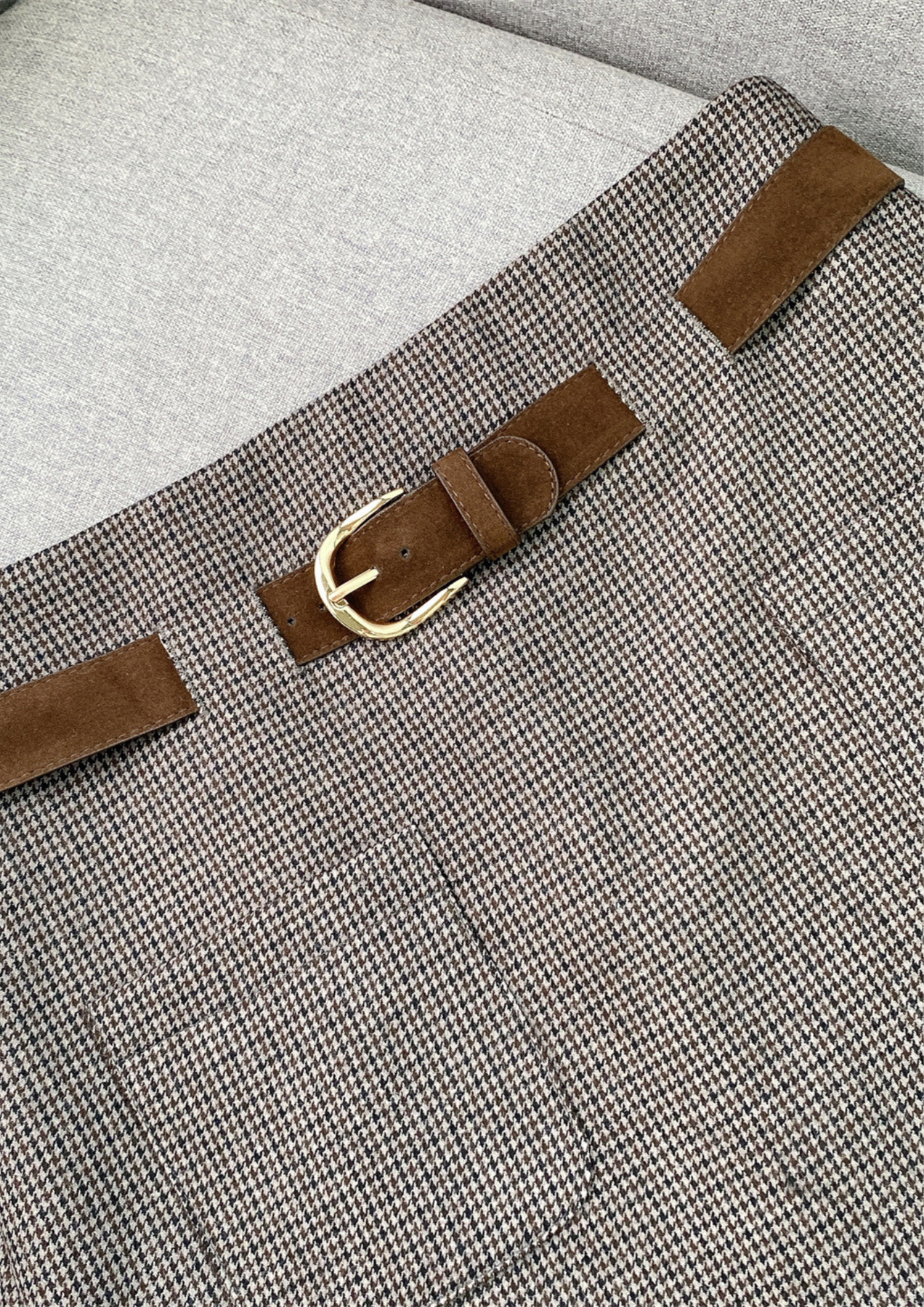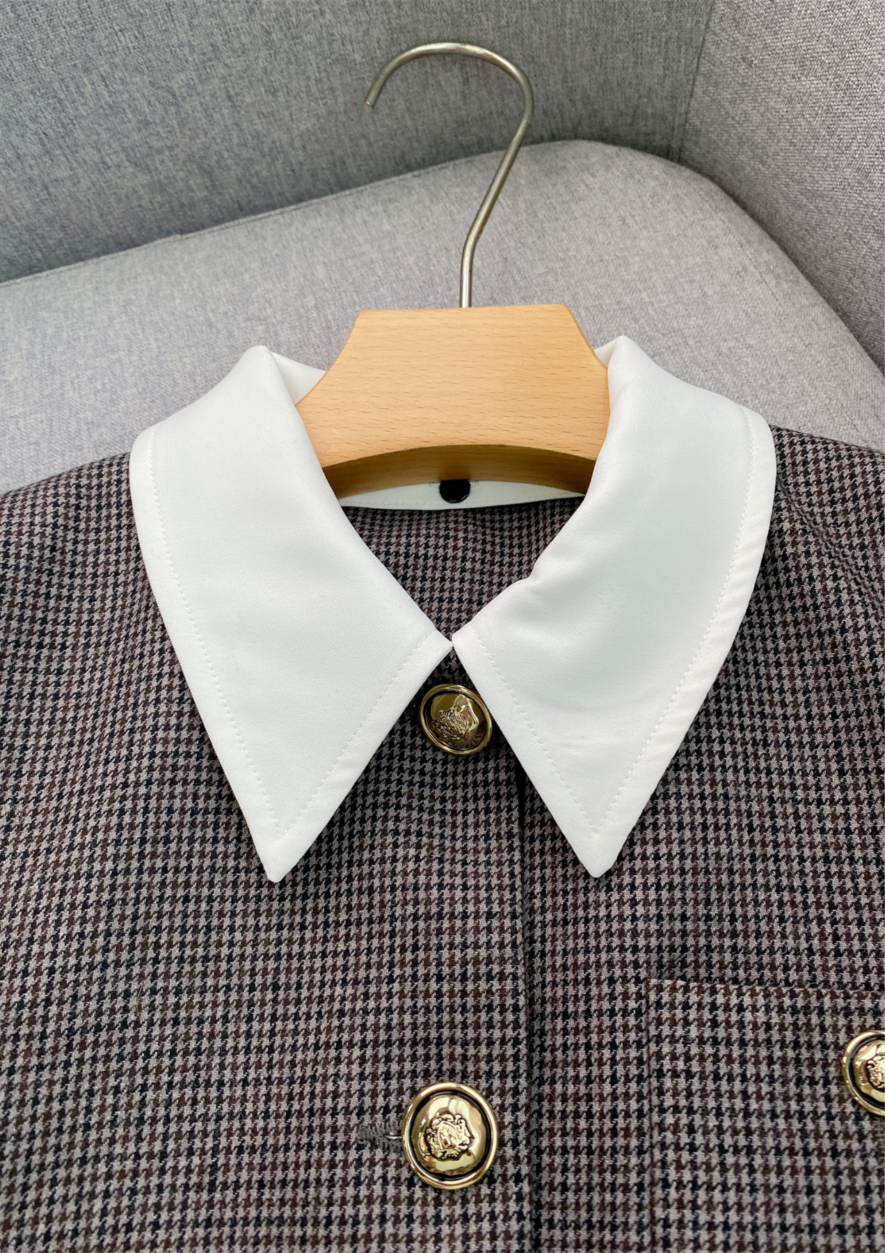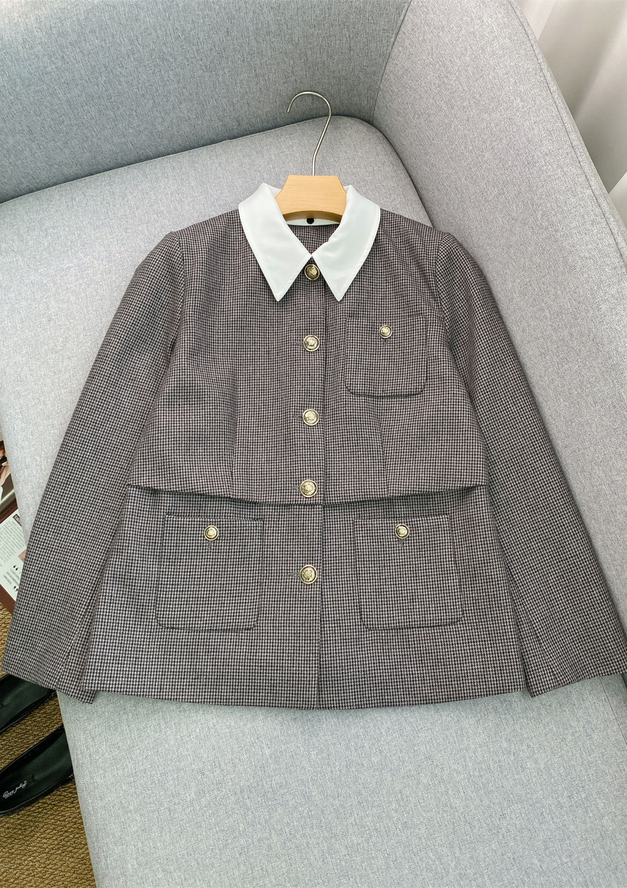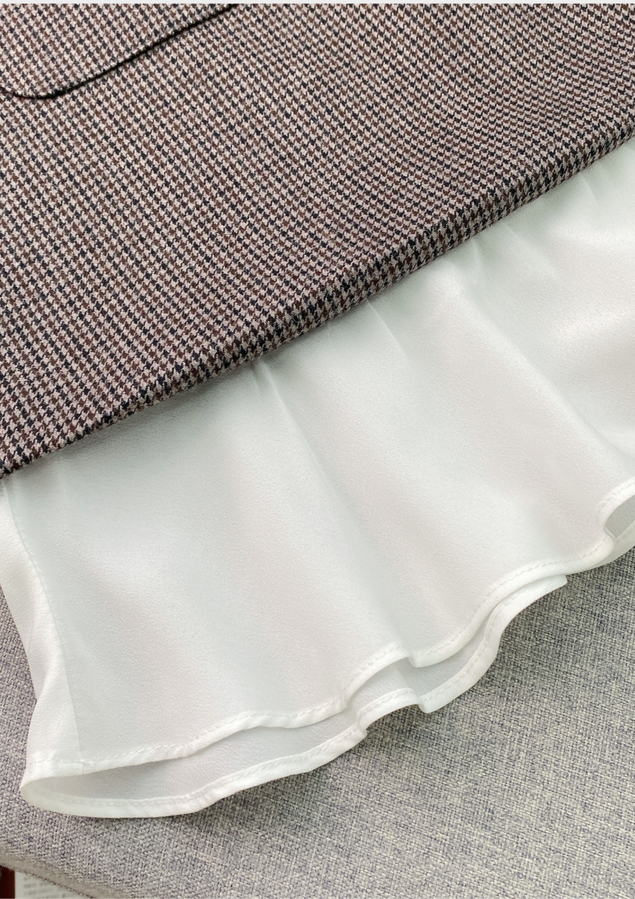 A chic preppy two-piece tweed set featuring a crisp contrast collar jacket and a layered ruffle-hem skirt for an instantly polished, feminine look.