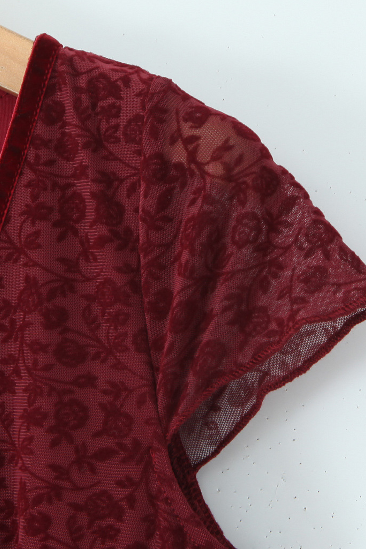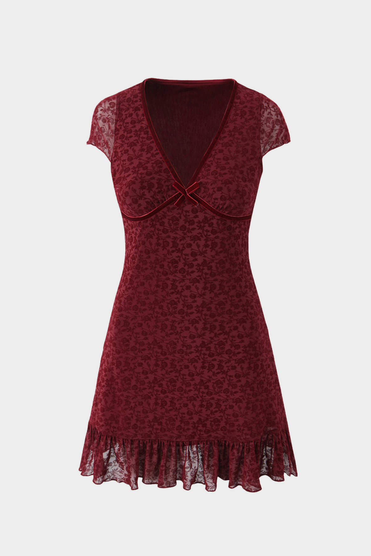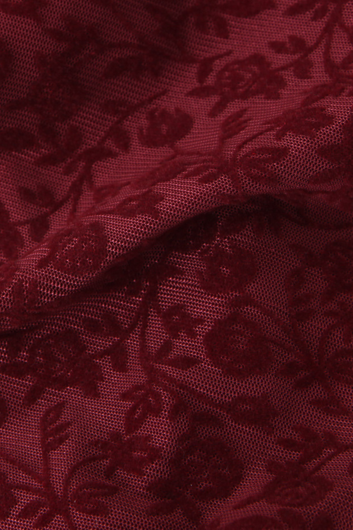 Elegant retro-inspired mini dress crafted from soft flocked mesh with a subtle floral motif.
