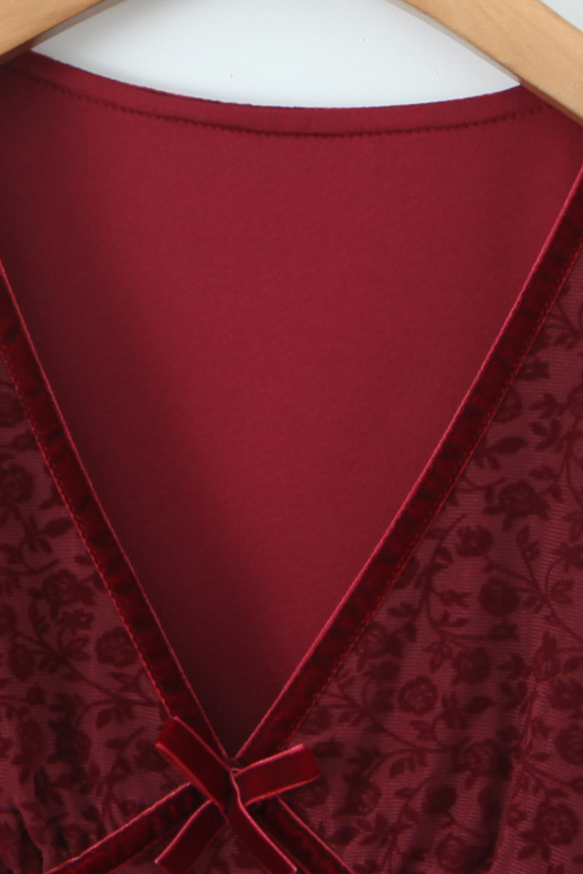 Features a flattering V-neckline adorned with a delicate velvet bow at the bust for a feminine touch.